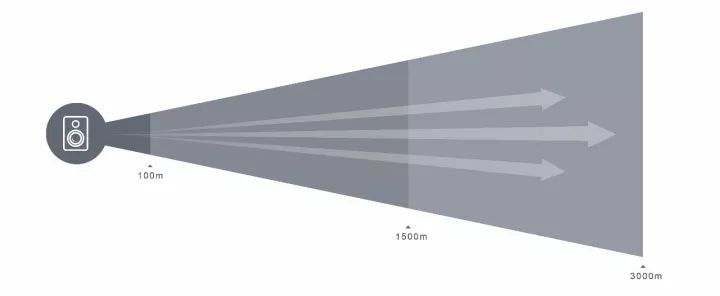 強聲定向裝備工作時發射一個波束角度為30°指向性聲波,可以廣播清晰的語音信息和高強度的警示音(實時語音或預錄語音均可),聲音傳輸距離最遠達到6000米,而且聲音高度定向:正向區域內聲音清晰、衰減低,后向和周邊區域聲音衰減迅速,干擾小。